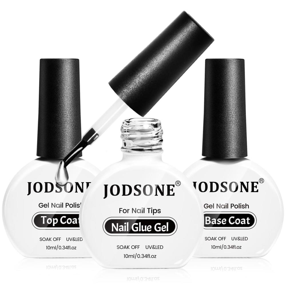 What You Will Receive: JODSONE 3Pcs 10ml Top Coat, Base Coat, and Nail Glue Gel Set. The nail glue gel provides strong adhesion for nail tips and decorations, the base coat protects your natural nails, and the top coat delivers a high-gloss, long-lasting finish.