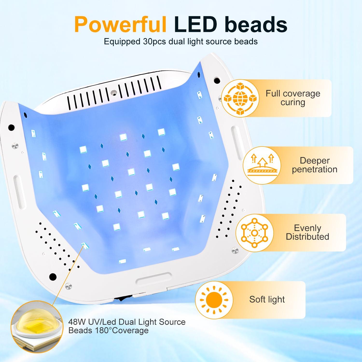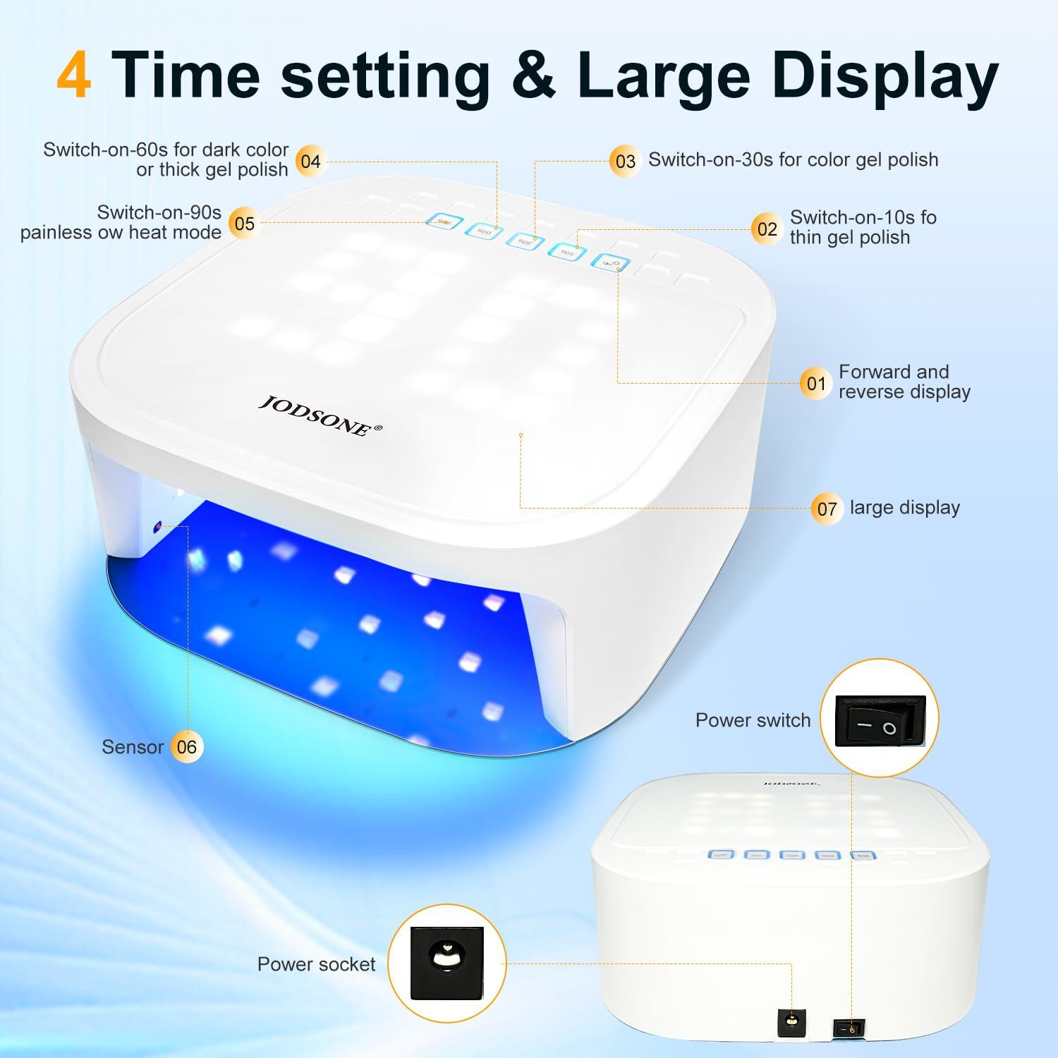 Intelligent Sensing: 4 precise timing modes, respectively 10S, 30S, 60S, 90S, with a large digital LCD display; with intelligent touch design to put your hand inside the manicure lamp, it can be lit automatically.